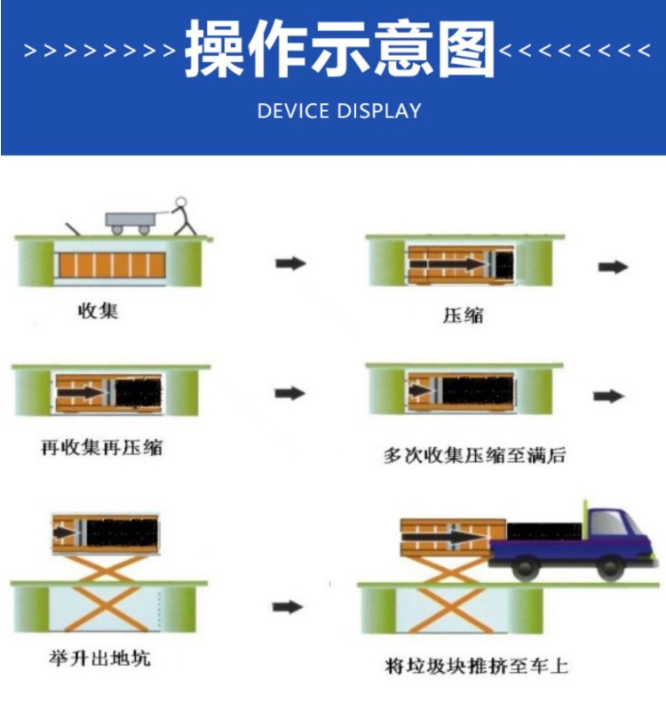 水平式生活垃圾壓縮中轉(zhuǎn)設(shè)備是將垃圾的卸(出)料、壓縮、儲(chǔ)存集合在一起,整體落于地下,利用地下空間將垃圾密閉在箱體內(nèi),地面上無垃圾外露現(xiàn)象,壓縮垃圾產(chǎn)生的污水經(jīng)排污管道直接流入污水井內(nèi),然后由污水泵排到城市污水管網(wǎng),徹底解決了垃圾在收集、儲(chǔ)存、裝運(yùn)過程中的污染環(huán)境、作業(yè)效率低等問題。